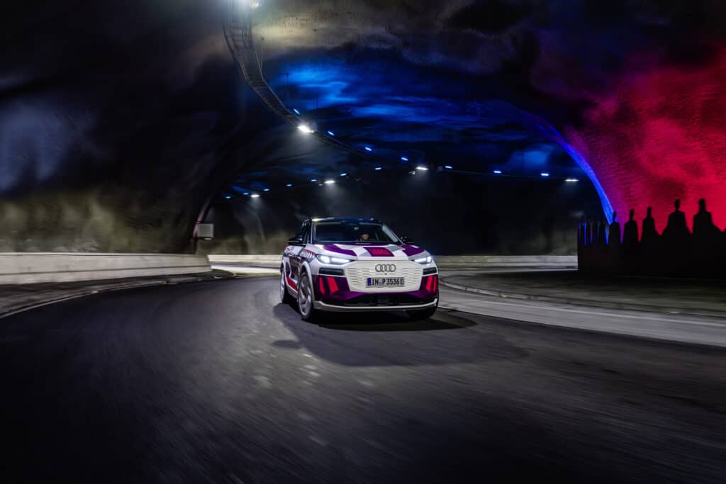 אב הטיפוס של האאודי Q6 אי-טרון בצבעי הסוואה בנסיעה במנהרה מוארת בתאורת לד