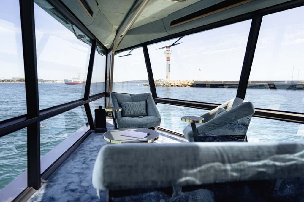 מבחינת עיצוב הפנים, הודות לעיצוב ה"אוריגמי", גובה התקרה מאפשר לנוסעים אפילו לעמוד בזמן השייט. תא הנוסעים מחולק לשני אזורי טרקלין שונים, עם שטיחים, שישה כיסאות מסתובבים ושולחנות. בנוסף, במרכזה של עמדת ההגה נמצא מרכז בקרה דיגיטלי עם מסך בגודל 32 אינץ' ברזולוציית 6K, המזכירה את מערכת ההפעלה BMW iDrive בעלת השליטה הקולית. על פי ההודעה לתקשורת של טייד כל הרהיטים עשויים ממתכת מגורענת שבמפגש עם קרני אור השמש יוצרת השתקפות של גלי הים.