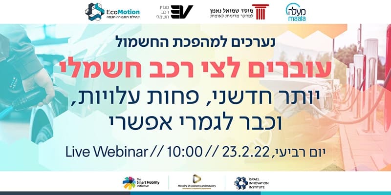 ב-23.2 (רביעי) בשעה 10:00 יתקיים אירוע (וובינר לייב) שיעסוק בכל מה שצריך לקראת המעבר לצי רכב חשמלי. האירוע בא לתת ידע פרקטי לקראת פרויקט המרת הצי האופרטיבי לחשמלי בתאגידים, חברות פרטיות וגופים ציבוריים. באירוע נציג מודל כלכלי לחישוב החזר ההשקעה, נעסוק במשמעויות הכלכליות של מעבר לצי רכב חשמלי ונשמע מחברות שכבר עשו את זה.