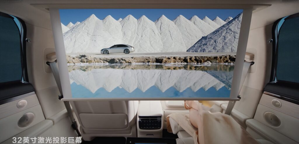 זה מתחיל במערך מסכי תצוגה קדמיים שכולל מסך 12.3 אינטש רחב ומסך 15.6 אינטש מרכזי אבל מה שמעניין באמת קורה בחלקו האחורי של הסטלטו S9, הנוסעים שם יוכלו ליהנות מחוויית נסיעה וצפייה הכוללת טאבלט 12.3 מובנה ומסך נוסף, 32 אינטש שיורד מהתקרה עליו ניתן להקרין תכנים בעזרת פרוג'קטור מובנה. יש גם מושבי עיסוי חשמליים, מאווררים ומתכווננים עד למצב שכיבה, משטחי טעינה אלחוטיים מאחורה ומקדימה ועוד.