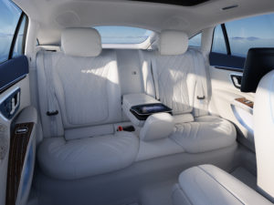 פנים הרכב באמת יוצא דופן, ונראה שפנים הרכב עמוס בטכנולוגיה ובפיצ׳רים שעוד לא ראינו ברכבים אחרים. ה-EQS מצוידת במסך מולטימדיה ענק, שמשתרע לאורך 56 אינטש (ולמעשה בנוי משלושה מסכים שונים), ועמיד בפני טביעות אצבעות ובפני שריטות, ובמערכת מוטלמדיה המתקדמת של מרצדס, ה-MBUX.