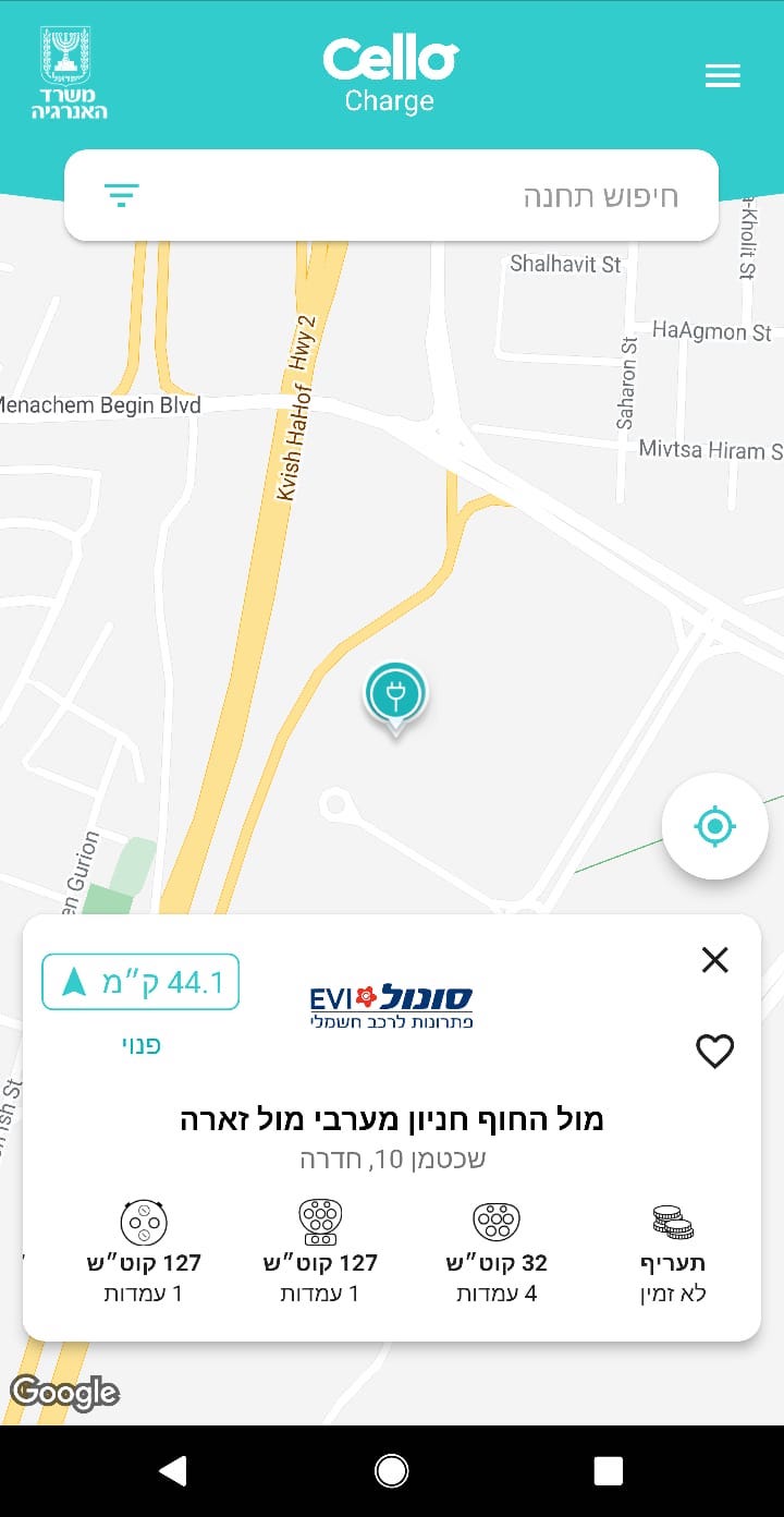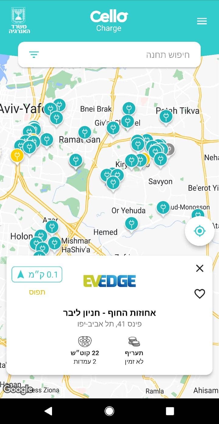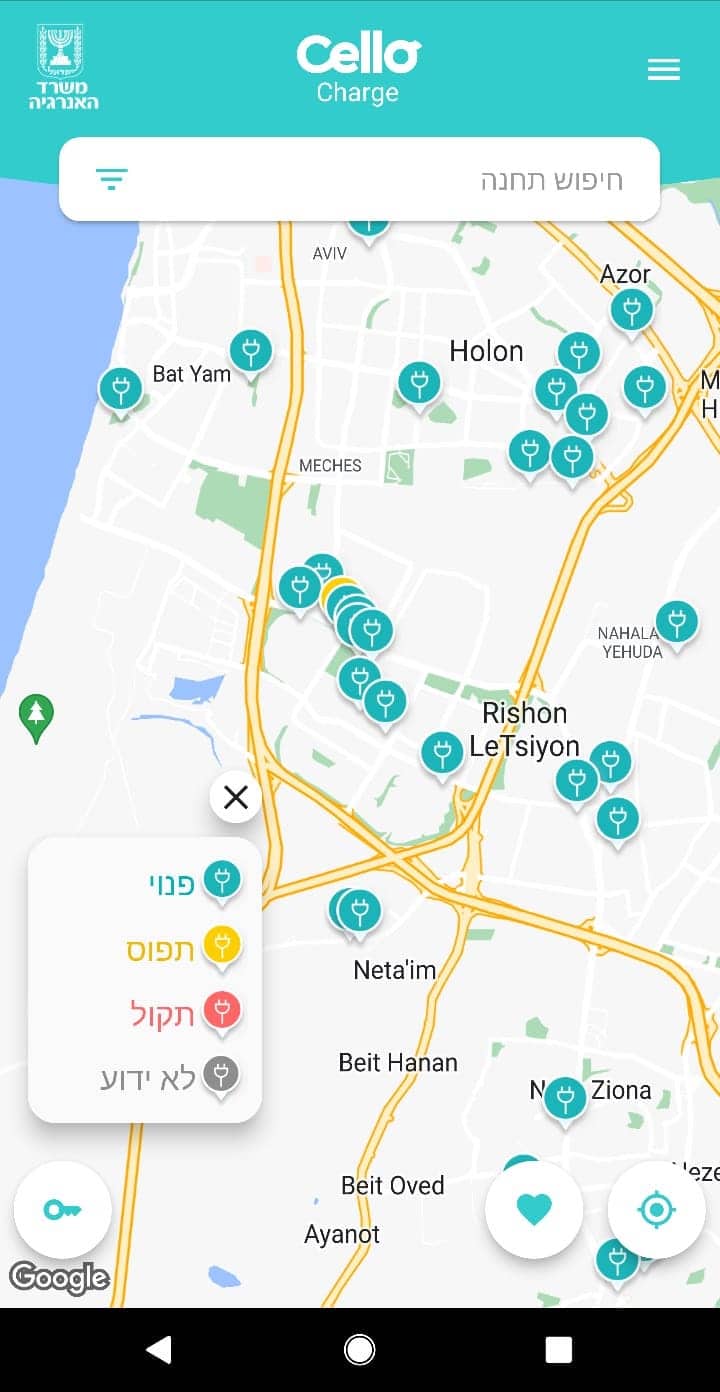 משרד האנרגיה השיק היום אפליקציה (בגרסת בטא) לאיתור עמדות טעינה בישראל, באמצעות חברת Cello (לשעבר CelloPark). האפליקציה מציגה גם את העלויות ומצבן של העמדות בזמן אמת.
