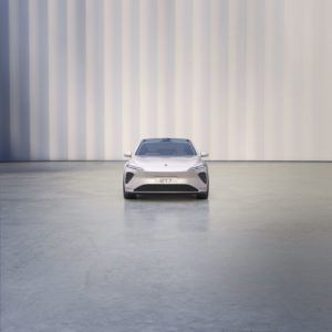 מבט מקדמת הרכב על הסדאן החשמלית החדשה של חברת ניו, ה-ET7 בצבע לבן