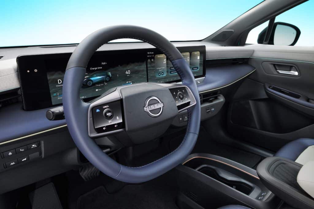 הניסאן ליף החשמלית מציגה תא נוסעים מודרני, עם לא מעט כפתורים, שני מסכי תצוגה, 12.3 אינטש ו-14.3 אינטש שמתחברים מסך אחד גדול, מערכת שמע של BOSE, גג פנורמי, שלל מערכות בטיחות מתקדמות ועזרי נהיגה לנהג, יכולת הוצאת חשמל לבית (V2H) ועוד.