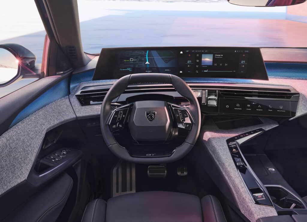 זו לא הפעם הראשונה שאנחנו נחשפים לעיצוב הפנימי של הרכב, שנחשף כבר ביולי השנה. הרכב מצויד במסך רחב בגודל 21 אינטש, שנמתח מאיזור לוח המחוונים ועד למרכז הרכב והוא ישמש כלוח המחוונים, מערכת הניווט ומערכת המולטמידה של הנהג. מערכת המולטימדיה תומכת אלחוטית באנדרואיד אוטו ובאפל קארפליי. מערכת השמע של הרכב מצוידת בעשרה רמקולים, ופיג׳ו תציע את האופציה לשדרג את החלונות הקדמיים לזכוכית רבודה, שצפויה לשפר את בידוד הרעשים.