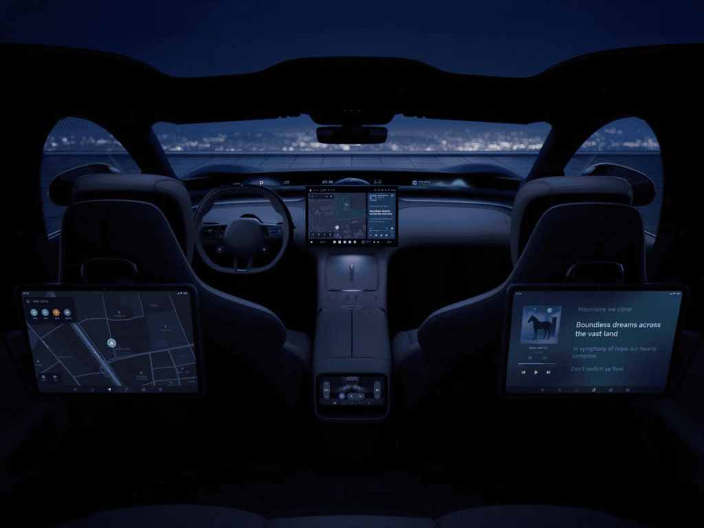 העיצוב מינימליסטי, חף כמעט לחלוטין מכפתורים פיזיים, עם מסך תצוגה בגודל 16.1 במרכז הדשבורד, מסכי תצוגה ליושבים בשורת המושבים השנייה + מסך דיגיטלי לבקרת האקלים, תא גדול מובנה בקונסולה המרכזית, משטחי טעינה אלחוטית, מושבים חשמליים מתכווננים מקדימה ומאחורה ופונקציית עיסוי למושבים הקדמיים ועוד.